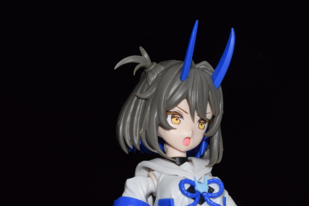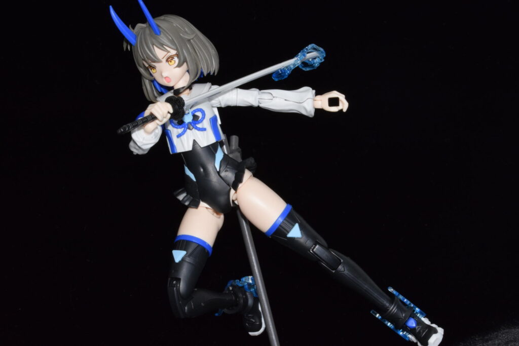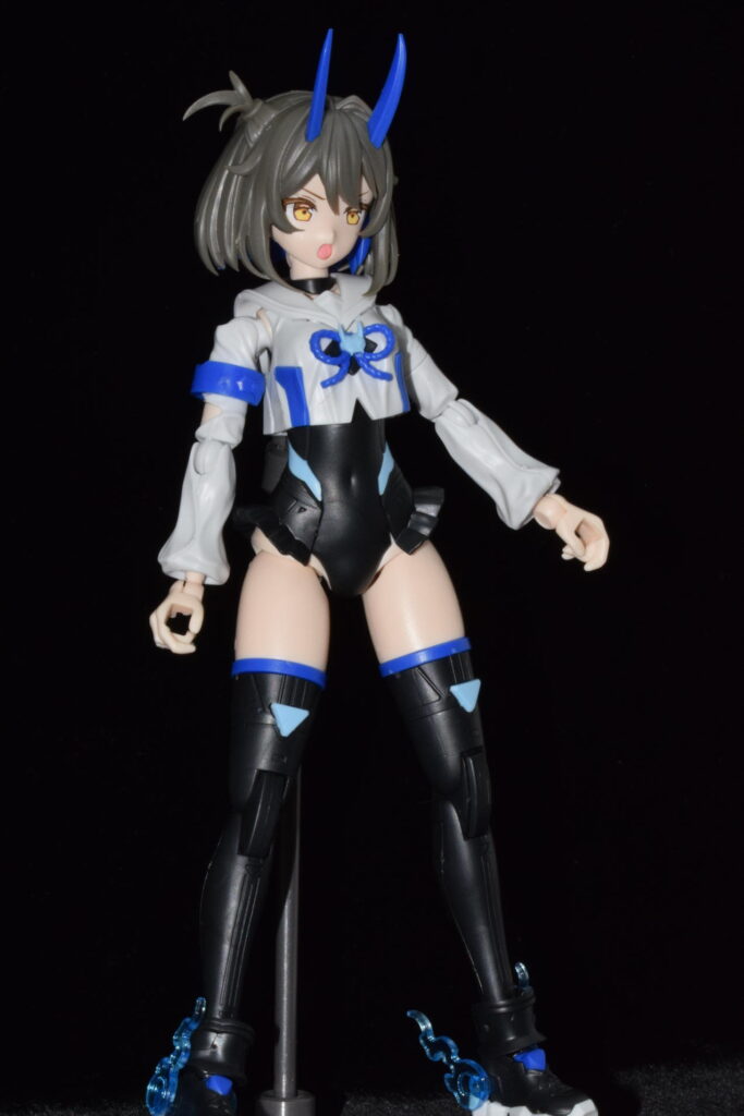 肩と背中にアーマーを装着した戦闘形態。鬼の角を連想させる鋭い装備が加わり、一気に力強い印象へと変わります。
