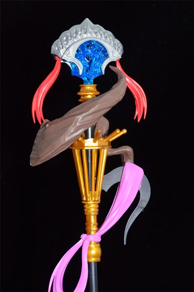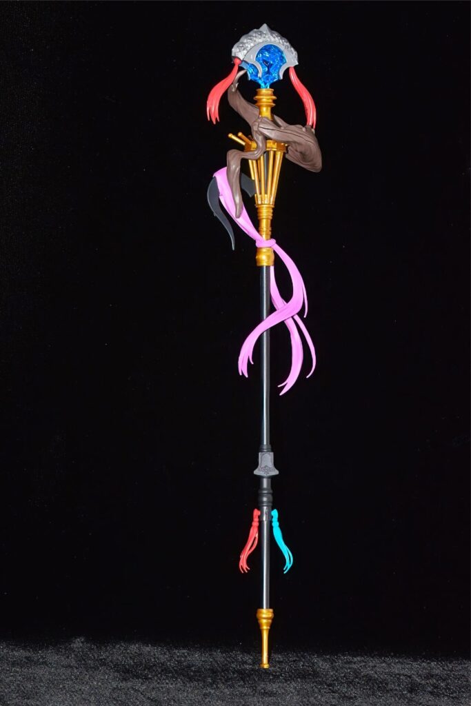 象徴的な杖も、先端の宝石や巻き付いた布の質感がプラスチックで見事に表現されており、非常に芸が細かいです