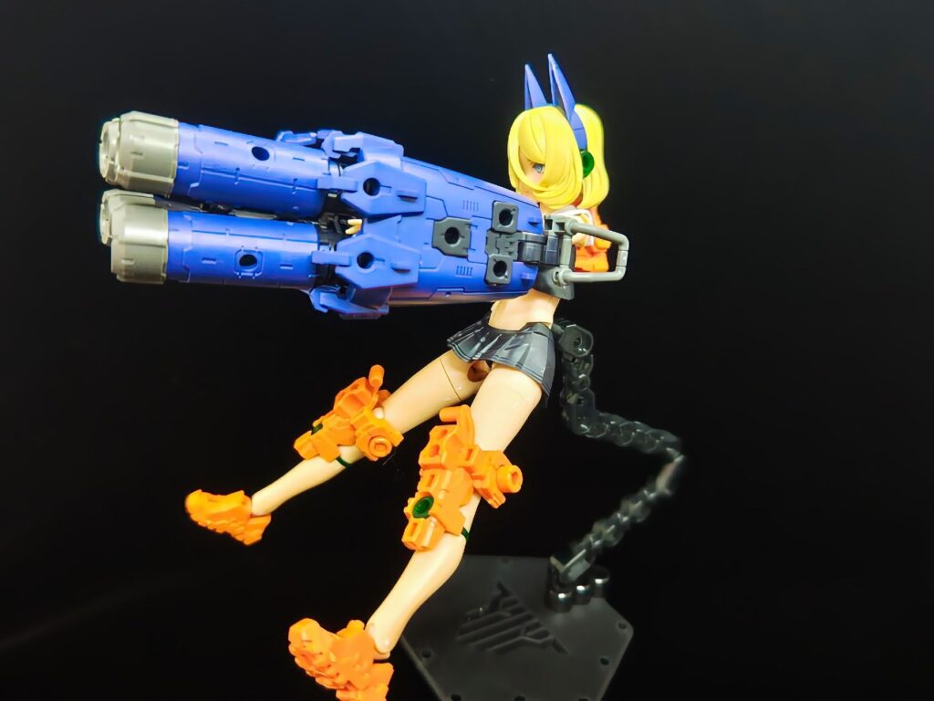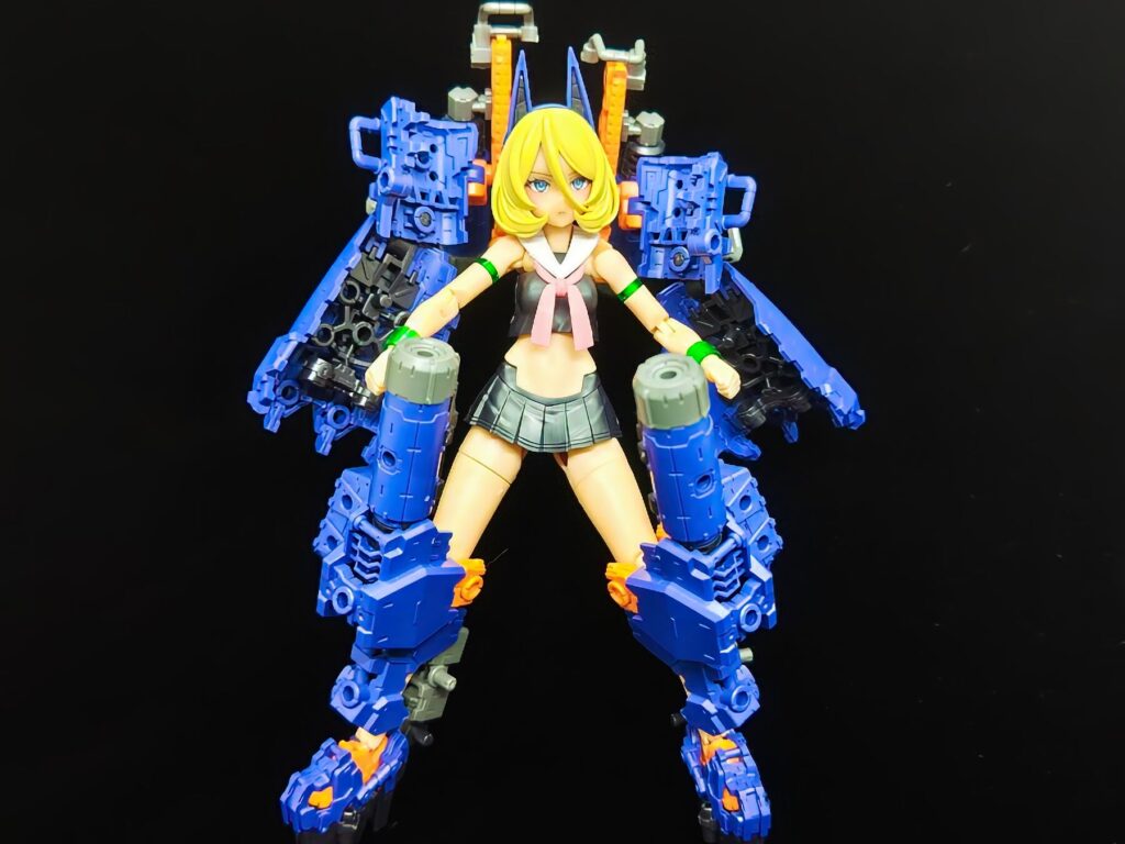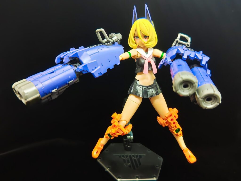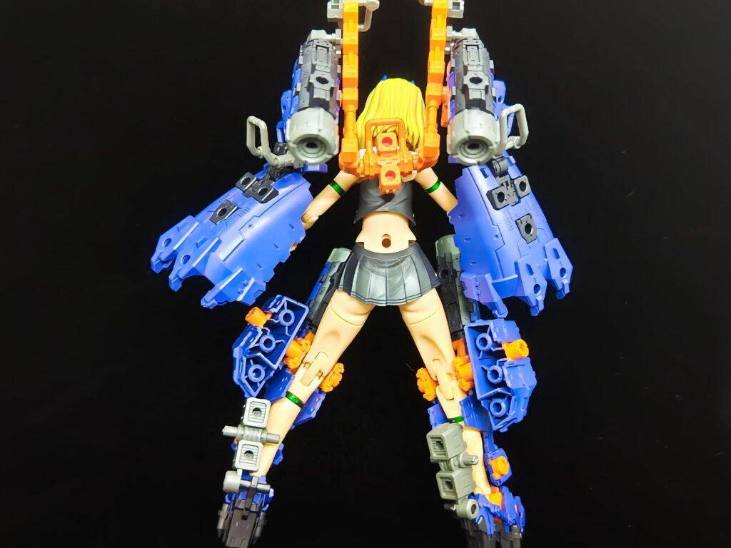 大型の武装を腕に装着しました。ヘビーアームズを彷彿とさせるような、メカニカルで重厚なシルエットに変化します