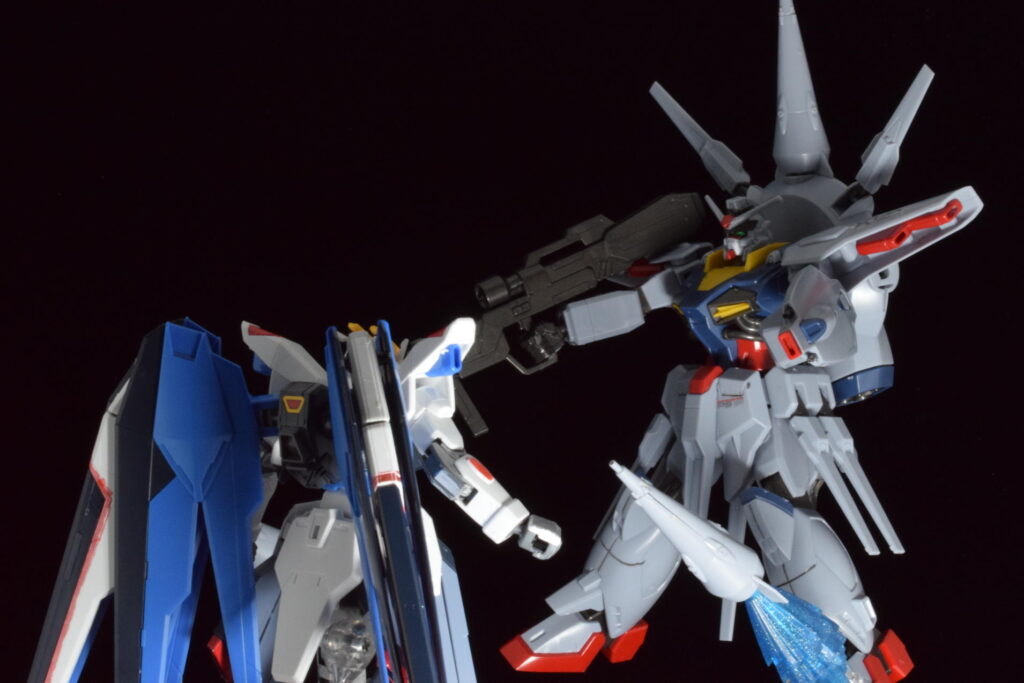 HG フリーダムと並べてみました。キラ・ヤマトは後の作品でも苦戦する場面はありますが、精神面や機体性能の差ではなく、純粋なパイロットとしての技術と殺気で彼を極限まで追い詰めたのは、やはりクルーゼが最後だったのではないかと感じています