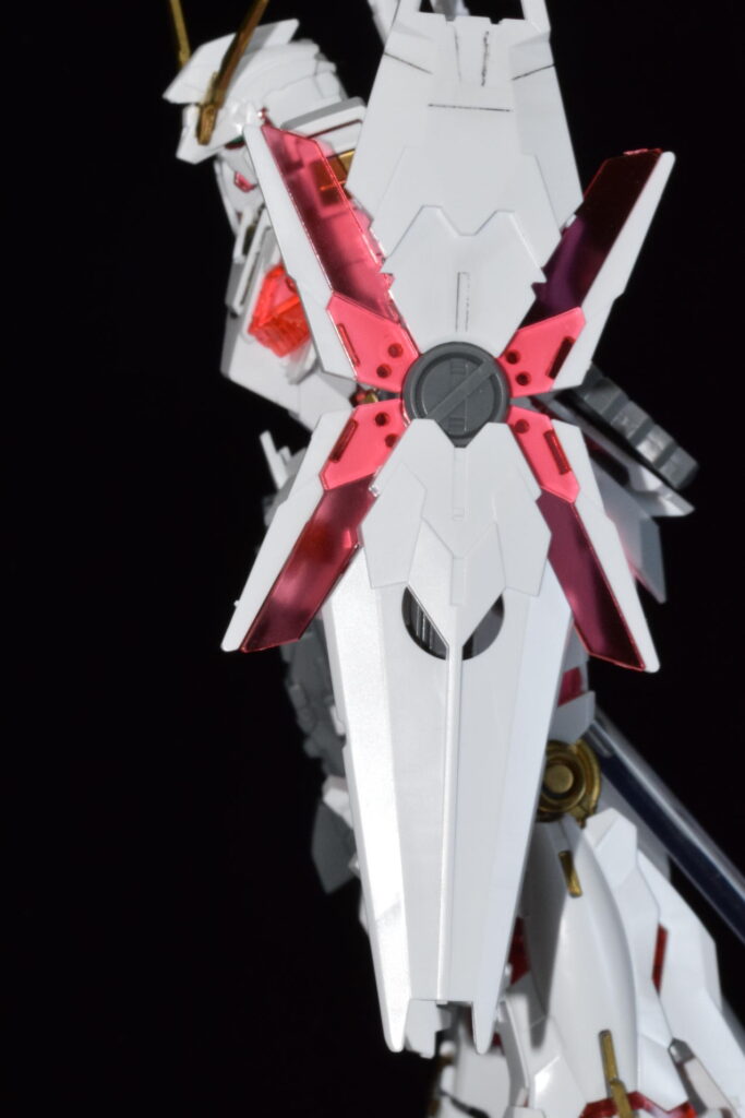 展開したサイコフレームが露出するシールドのデザインは、他のガンダム作品にはない唯一無二の存在感を感じさせます