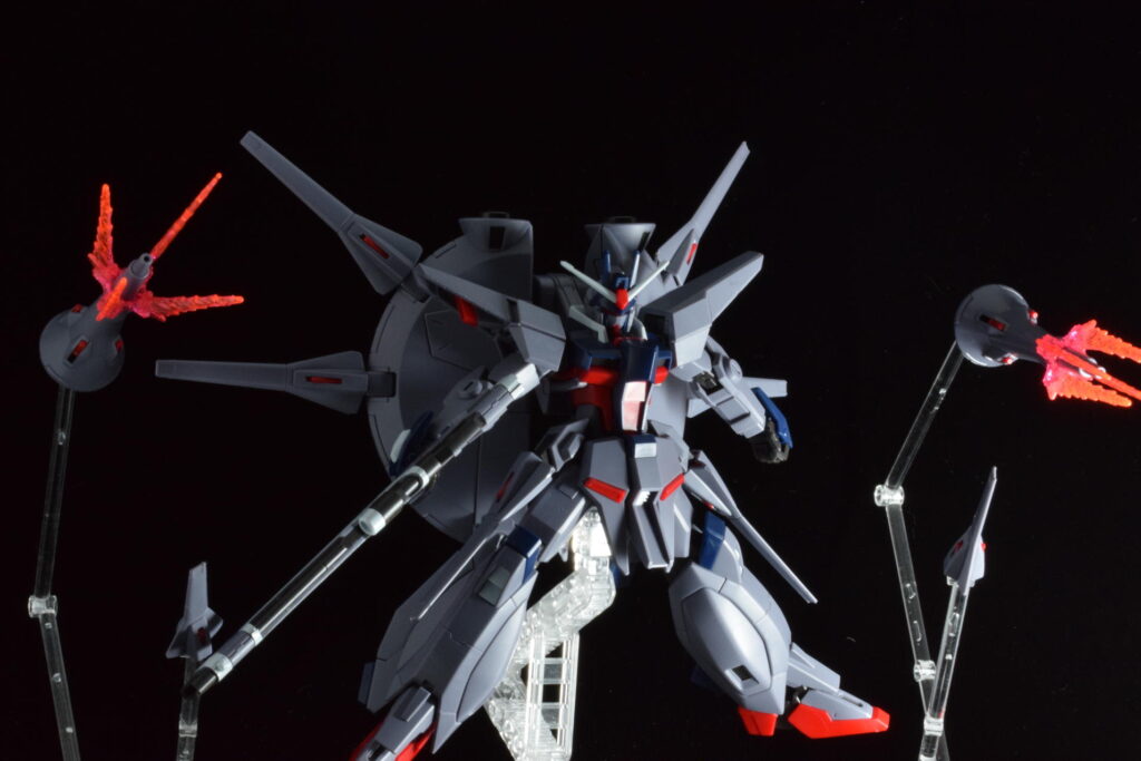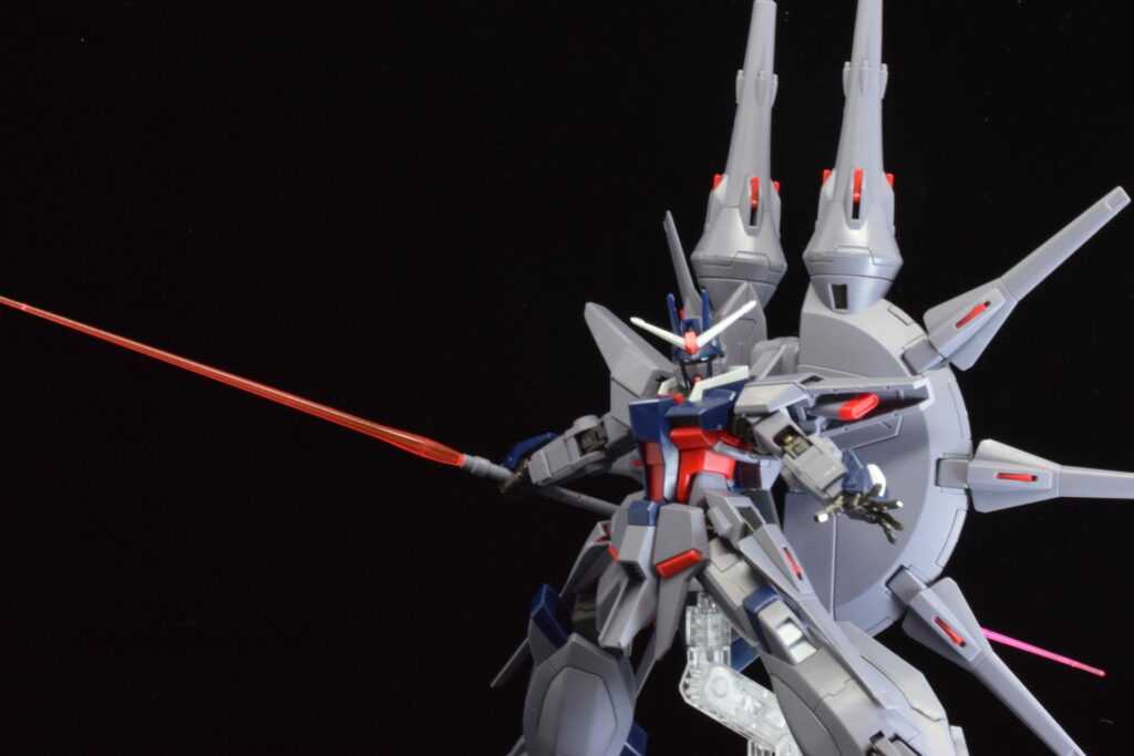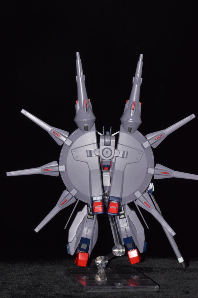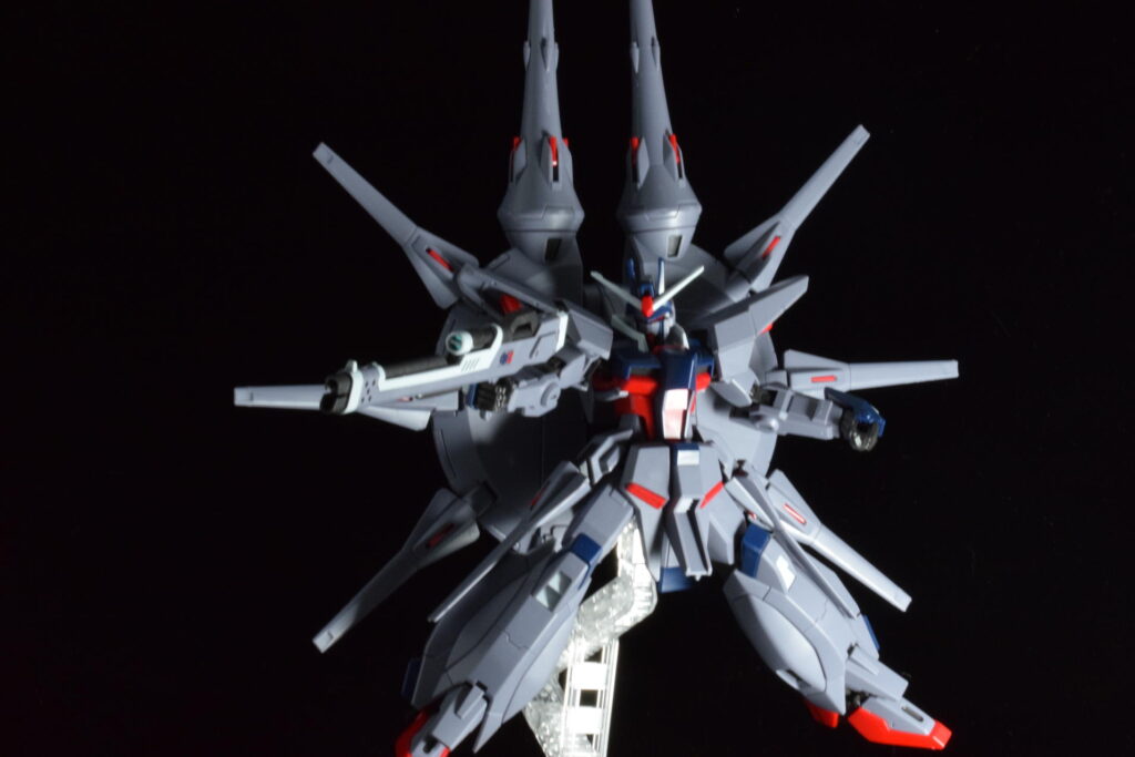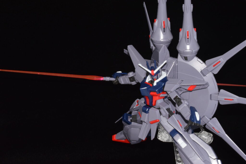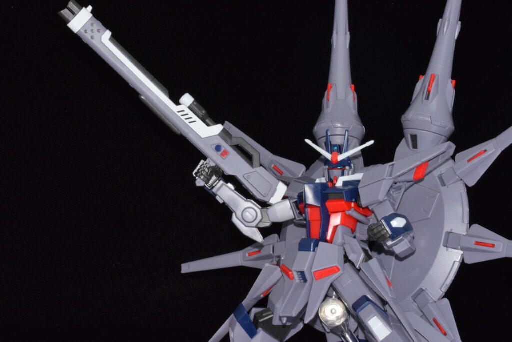 前作のラスボス機であるプロヴィデンスガンダムの系譜を受け継いでおり、さらに数を増したドラグーンが背面に並ぶ姿は圧巻の一言です。