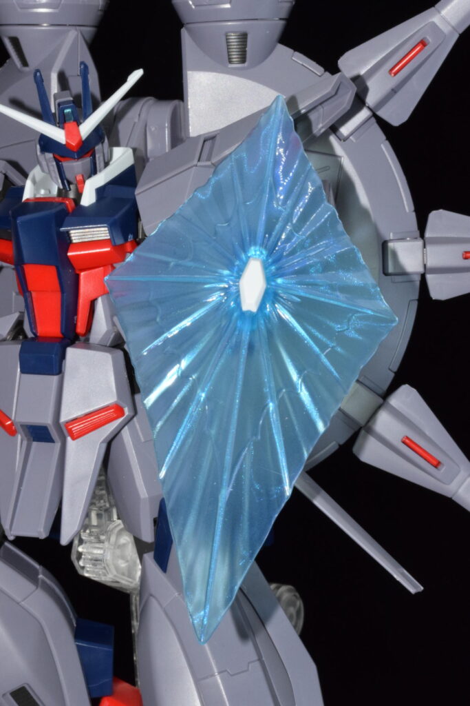 防御装備は特徴的なビームシールド。クリアパーツによって、劇中のエネルギー壁のような質感がうまく表現されています