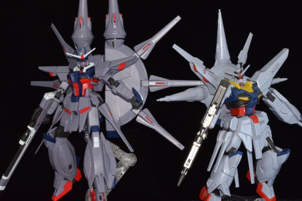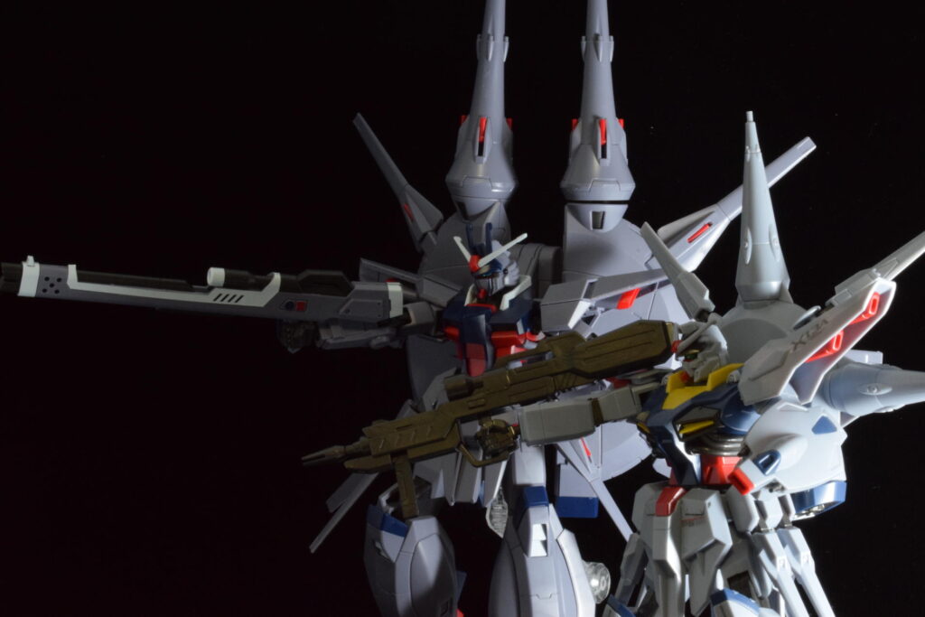 先代機であるプロヴィデンスガンダムと並べてみました。搭乗者のレイが背負っていた宿命を思うと、この二機が並び立つ姿にはどこか感慨深いものがありますね