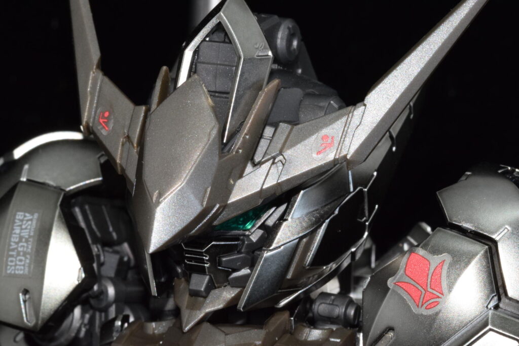 全身に施された鈍く光るメッキ加工は、まさに『鉄血』の名にふさわしい重厚感です。コーティングキットの宿命としてゲート跡(パーツを切り離した跡)は出ますが、死線を潜り抜けて傷ついたバルバトスの姿を思えば、それすらも歴戦のダメージ描写のように見えてくるから不思議です。