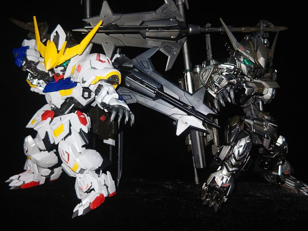 通常版のMGSDバルバトスと並べて。成形色を活かしたアニメらしい良さと、コーティング版の重厚な工芸品のような良さ、どちらも甲乙つけがたい格好良さです!