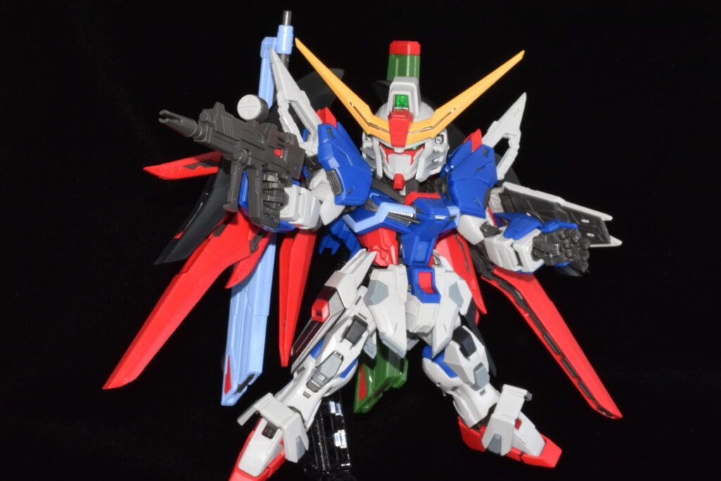 MGSDデスティニーを完成させてみて、SDガンダムの表現力の進化を改めて実感しました。以前製作した『HG デスティニーSpecⅡ』ともまた違った、パーツ一つひとつの情報量の多さに驚かされます。特に光の翼を展開した時のボリューム感は、デスクに飾っていても抜群の存在感です。